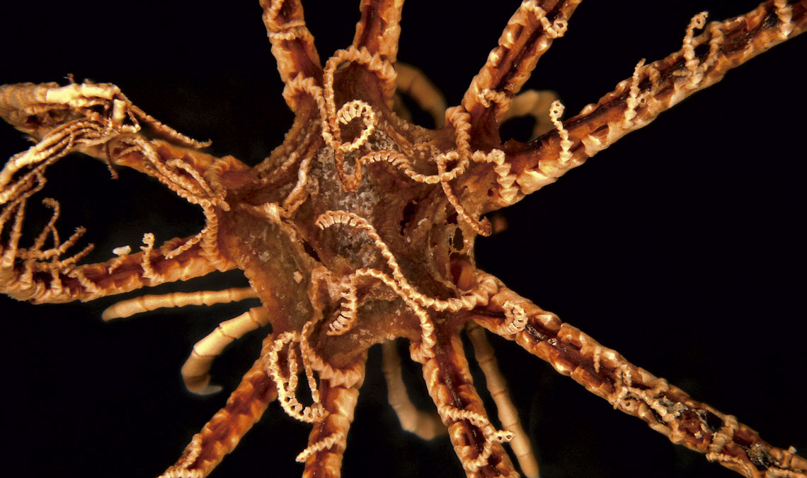 Parentes das estrelas-do-mar, os crinoides são pouco estudados. Existem cerca de 700 espécies, 22 delas na costa brasileira. A mais recente, após mais de um século sem novidades, é Comactinia auxiliadorae, descrita em outubro a partir de espécimes detectados pelo biólogo Túlio de Souza no Museu de Zoologia da Universidade de São Paulo (MZ-USP). Depois ele encontrou outro exemplar, também não classificado, no Museu de Zoologia Comparada da Universidade Harvard, nos Estados Unidos. Com cerca de 8 centímetros de comprimento, esses animais capturam partículas em suspensão com braços rendilhados enquanto se agarram à rocha com garras visíveis em segundo plano na fotografia.