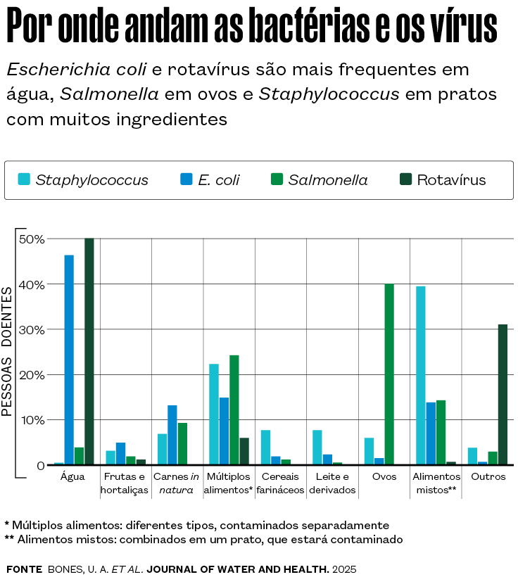 De 2000 a 2021, o Ministério da Saúde registrou 375.258 casos de pessoas acometidas por algum tipo das também chamadas doenças de transmissão hídrica e alimentar (DTHA), causadas, nesse período, por 78 organismos – bactérias, vírus, vermes ou protozoários. Apenas em 2023, 19.671 pessoas contraíram doenças causadas por água ou alimentos contaminados no Brasil, das quais 31 morreram. Foi um número maior que o do ano anterior, que registrou 14.336 doentes e 10 mortos.