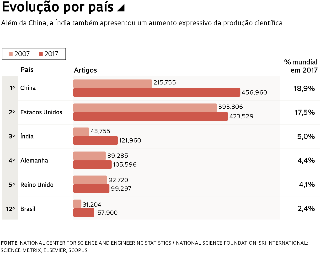 Em 2017, a China produziu 456.960 artigos, livros e resumos de conferências em ciência e engenharia registrados na base Scopus, o correspondente a 18,9% da produção mundial. Os dados da National Science Foundation, divulgados em 30 de maio, mostram que a China superou os Estados Unidos, que naquele ano publicaram 423.529 desses itens. De 2007 a 2017, a produção chinesa apresentou um crescimento anual de 8,43%, bem superior ao norte-americano (0,83%). Nesse levantamento, a Índia apresentou uma taxa anual de crescimento da produção acadêmica ainda maior (11,1%) e ficou em terceiro lugar, com 121.960 artigos, livros e resumos publicados em 2017. Entre os maiores produtores de ciência no mundo, o Brasil ocupou a 12ª posição, com 57.900 artigos publicados em 2017 e uma taxa anual de crescimento de 6,8%. O país com a maior taxa de crescimento foi o Irã, com uma produção aumentando 15,3% ao ano nos 10 anos analisados e 45.627 documentos publicados em 2017. A China não se mostrou apenas em rápida expansão, mas também mais protecionista. Em junho, o governo da China determinou que estudos feitos com genes, células, órgãos ou informações da sua população deverão ter ao menos um participante chinês entre os pesquisadores. Em vigor desde 1º de julho, as novas regras determinam que as organizações estrangeiras que usarem os materiais biológicos devem obedecer às leis chinesas, trabalhar em cooperação com os institutos chineses e compartilhar dados e patentes. Quem não seguir as determinações poderá ser multado (The Scientist, 17 de junho).
