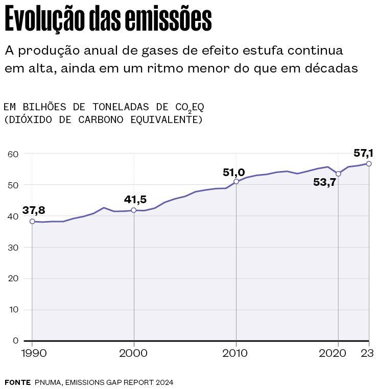Nenhum dado concreto indica que um corte pela metade nas emissões, como preconizado por diversos estudos, esteja a caminho no curto prazo. Ao contrário. São raros os anos, como durante o auge da pandemia de Covid-19 em 2020, em que a economia mundial não bateu recorde na liberação de dióxido de carbono (CO₂), metano (CH₄) e óxido nitroso (N₂O), a trinca de compostos que constitui a quase totalidade dos gases de efeito estufa (ver gráfico abaixo).