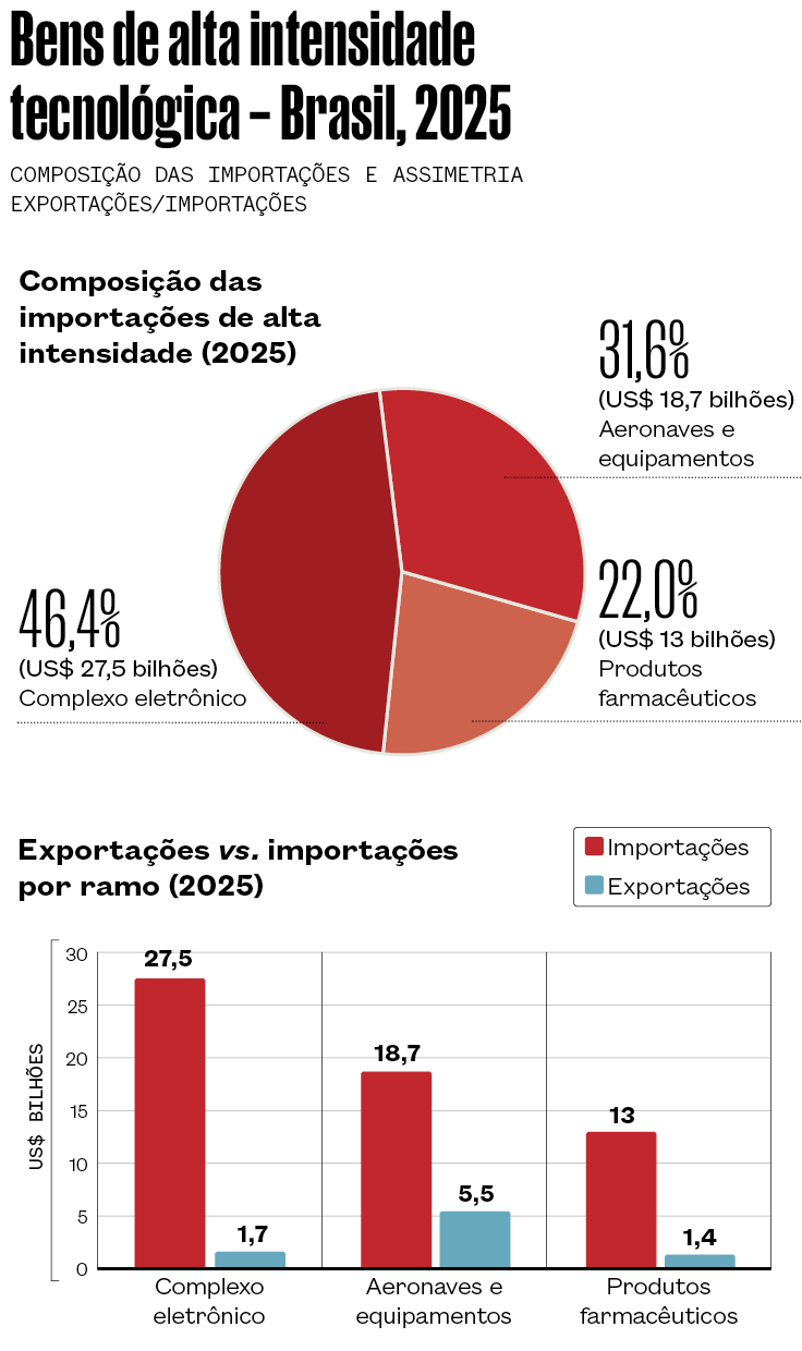 - O déficit no comércio exterior dos bens de alta intensidade tecnológica – formado pelo complexo eletrônico, produtos farmacêuticos e equipamentos aeronáuticos – atingiu US$ 50,6 bilhões em 2025, ultrapassando pela primeira vez a marca de US$ 50 bilhões e configurando o maior saldo negativo da série histórica
