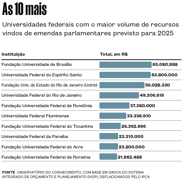 “Uma das requisições do STF foi que as fundações de apoio divulgassem com clareza os projetos de emendas”, explica Inácio. Como um dos resultados, em fevereiro, o MEC publicou uma portaria que estabelece orientações para o uso desses recursos e à prestação de contas pelas instituições federais de ensino e suas fundações de apoio. Inácio também levantou as 10 universidades federais com o maior volume de recursos previstos para este ano. A Fundação Universidade de Brasília, ligada à UnB, ocupa a primeira posição, com R$ 65,08 milhões, seguida pela Universidade Federal do Espírito Santo (Ufes), com R$ 63,8 milhões, e pela Fundação de Apoio à Universidade Federal do Estado do Rio de Janeiro (Unirio), com R$ 56 milhões (ver infográfico abaixo).