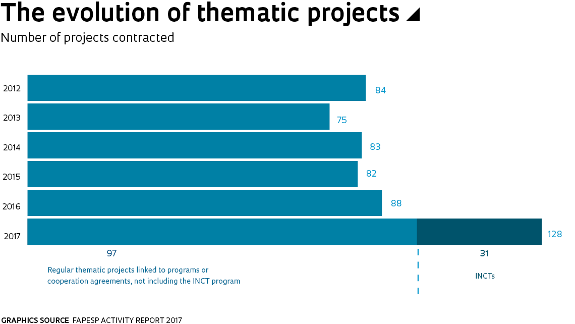 Thematic projects In 2017, FAPESP funded 128 new thematic projects, 45% more than in 2016, when there were 88, and higher than the average for recent years (see table). This grant mechanism is designed to support research with more daring objectives, developed by teams of researchers from various institutions and for a longer term of up to five years. The growth over the previous year was influenced by a call for proposals by the Brazilian National Institutes for Science and Technology (INCT) program, which was born of a partnership between the federal government and state research funding agencies, and aims to create networks of researchers working in strategic fields and on pioneering issues. FAPESP provides 50% of the funds allocated to INCT institutes in São Paulo and accepted 31 new thematic projects under the program in 2017. Even excluding those agreed under the INCT program, the number of thematic projects contracted in the year was 97, nine more than in 2016.