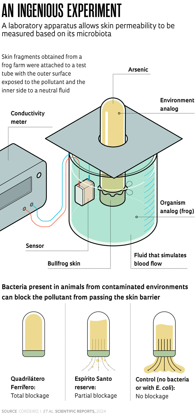 Back in the lab, the researchers sterilized the bullfrog skins and applied four different treatments to their outer surfaces: arsenic-tolerant bacteria from amphibian skin from the Quadrilátero Ferrífero, bacteria from frogs from the uncontaminated area, and two controls—one was left bacteria-free and one applied with only Escherichia coli, which typically does not inhabit skin (see infographic). The results supported the researchers’ protective layer hypothesis: arsenic passage was blocked only in skins coated with bacteria collected from amphibians in the naturally contaminated regions of the Quadrilátero Ferrífero.