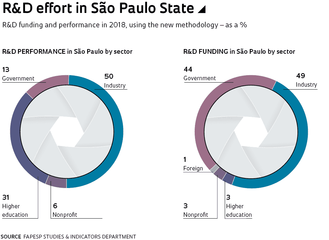 A new method of calculating research and development (R&D) investment in São Paulo has produced a more accurate and comprehensive picture of the amount of effort being devoted to R&D and ultimately to generating scientific knowledge, innovation, and wealth in the state. The new methodology was developed and implemented by the Studies and Indicators department at FAPESP in a collaboration with Fundação SEADE. The redesigned approach conforms to internationally recognized methods, has an expanded coverage of entities engaged in R&D, supports the compilation of new R&D indicators, and refines the methods of compiling research metrics. In the new survey, R&D spend by universities, research institutes, and hospitals in the state amounted to R$12.87 billion in 2018. This is consistent with the R$12.12 billion in R&D investment in the same period as measured by the previous method and reported in FAPESP’s Activities Report, but the new survey is now more accurate and can be used to derive other metrics, such as each sector’s share in R&D funding versus performance (see chart).