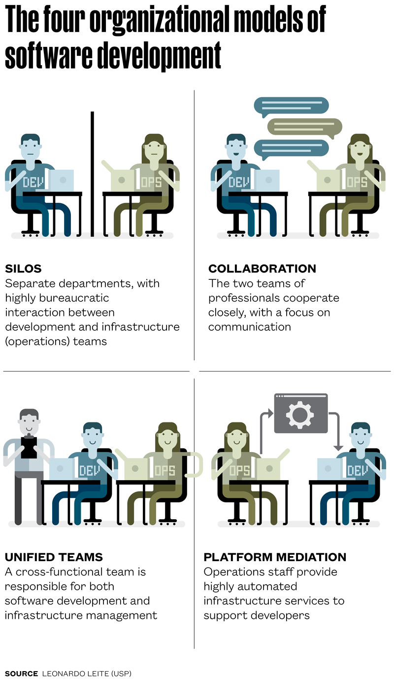The next step in the research was a qualitative study of 75 professionals from 59 Brazilian and international companies of varying sizes. To encourage professionals to speak openly about the problems faced at their companies, Leite chose to use anonymous interviews. From this data, he identified four organizational models in the software industry: silos, collaboration, unified teams, and platform mediation (see infographic).