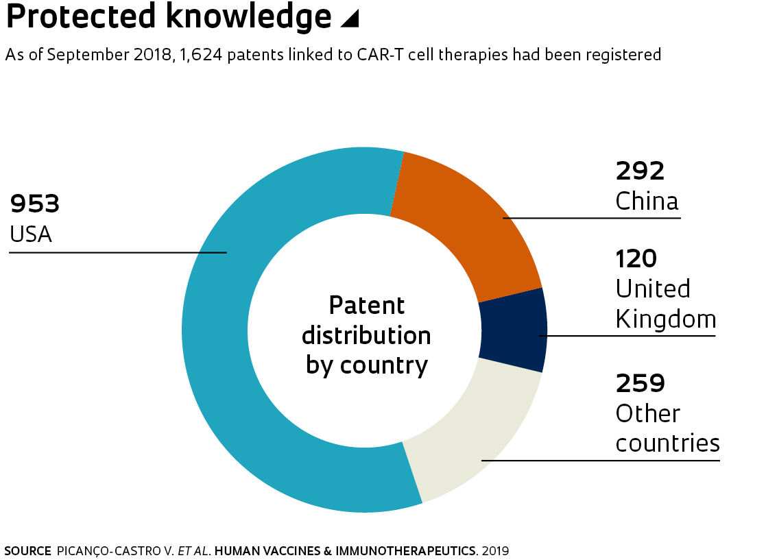 Promising treatment results have led to diversification in CAR-T production techniques and targets. As of September 2018, there were 679 different therapies, with 1,624 patents, according to a survey by the teams of Picanço e Castro and Geciane Porto, a researcher in the field of innovation and entrepreneurship management at the School of Economics, Administration and Accounting at USP-RP. Published in November in Human Vaccines & Immunotherapeutics, the study indicates that an important number of these therapies (218) target B cells, which are associated with hematological tumors. Another 95, however, had been developed—and were in the early stages of testing–to fight solid tumors, which affect the brain, breast, and other organs.