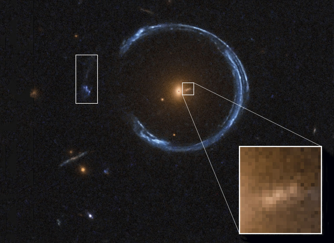 With a mass tens of times greater than that of the Milky Way, the galaxy itself behaves as a gravitational lens. It bends and amplifies the light from two much more distant galaxies sitting behind it—one located about 10.4 billion light-years away, and the other roughly 11 billion light-years from us. The system’s blue horseshoe is known in technical jargon as an Einstein ring. The middle galaxy’s light is lensed too, though it doesn’t produce the elegant circular arc that makes the system so striking. Instead, it forms a faint, blurred patch near the bright red galaxy and a bluish streak above the horseshoe—features visible in the smaller inset image highlighting details of the system.