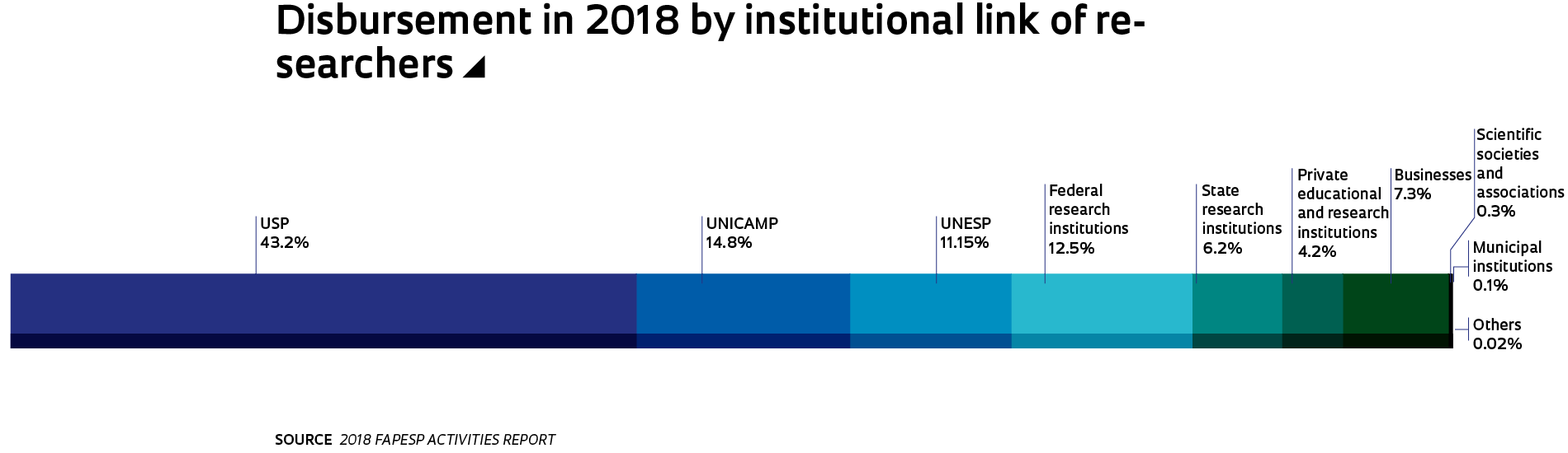 In terms of how the resources were distributed by field of knowledge, the 2018 data remains the same as that from previous years: life sciences accounted for 47% of disbursement; exact sciences, Earth sciences, and engineering, 33%; humanities and social sciences, 9%. The remaining 11% were allocated to interdisciplinary research. When the institutional links of funded researchers are analyzed, the University of São Paulo (USP) once again occupies first place, having received 43.2% of resources, followed by the University of Campinas (UNICAMP), with 14.8%. Federal research institutions in the state of São Paulo came in third, with 12.5%, and São Paulo State University (UNESP) held fourth place, with 11.2%.