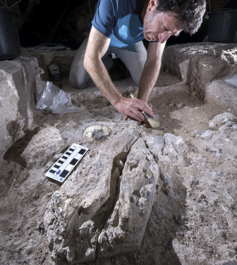 Boaz Langford / UHJYossi Zaidner of the Hebrew University of Jerusalem excavates a skull in Tinshemet CaveBoaz Langford / UHJ