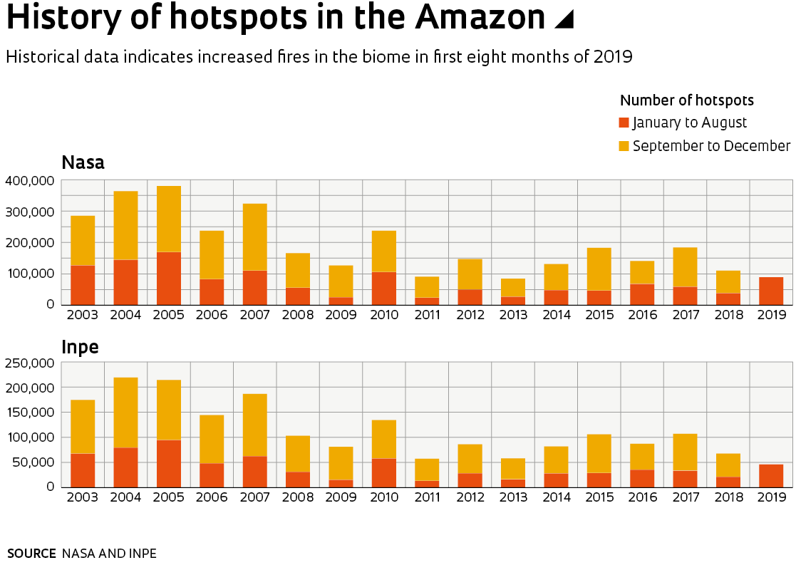 According to the historical data series produced by INPE since 2003, there were half as many hotspots in the first eight months of this year than there were in January to August 2005 (when more than 90,000 outbreaks were recorded), the Amazon’s worst year on record in terms of forest fires. NASA data also identifies 2005 as the year with the most fires in the region, with 170,000 hotspots seen in the first eight months. Although the current number of fires in the Amazon is lower than during the worst years of the past decade, the recent increase is concerning, and could be a sign of worse to come. The number of outbreaks detected between January and August this year was double the amount seen in the same period of 2018, according to both INPE and NASA counts. Historically, more than 50% of all fires, sometimes up to 80%, occur in the last four months of the year. September is usually the driest month in the region and consequently sees the most fires, whether of natural origin, caused by lightning, or due to the actions of humans.