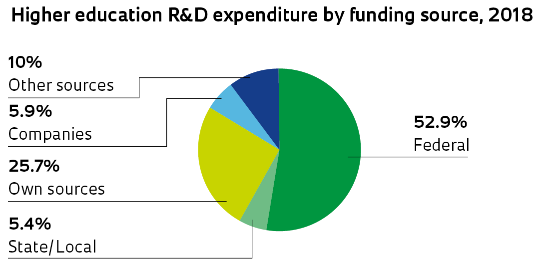 - The federal government funded 53% of higher education R&D, while state and local governments funded 5.4%