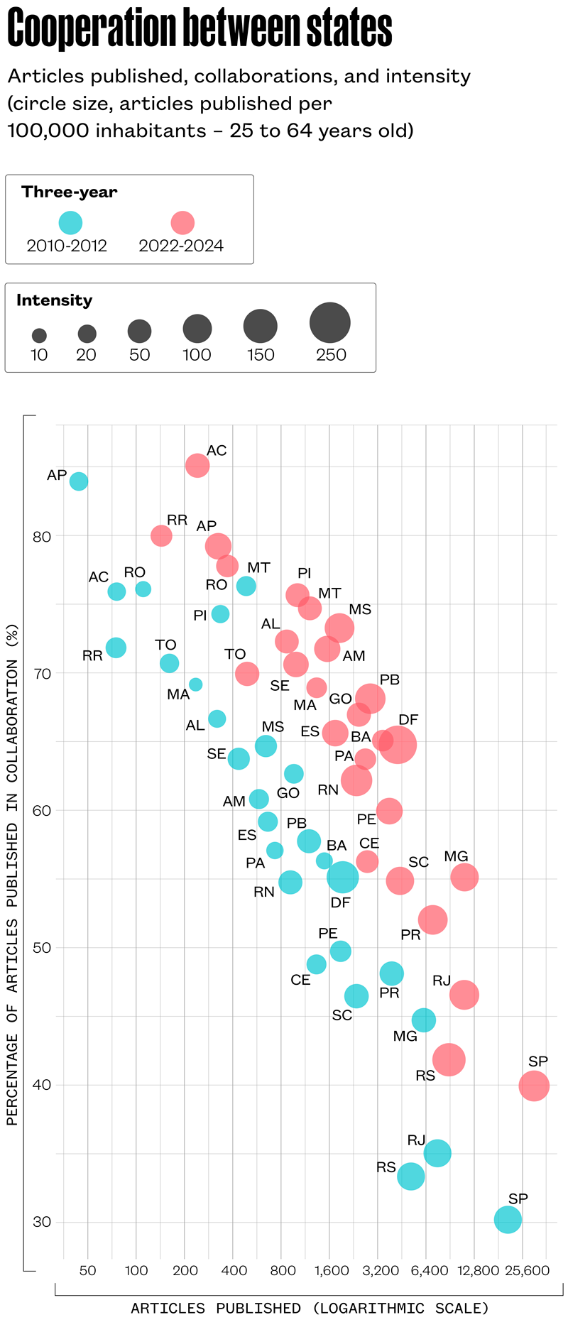 - In Brazil specifically, the intensity of interstate collaborations—meaning the percentage of papers published by each state involving authors from another state—is another interesting factor