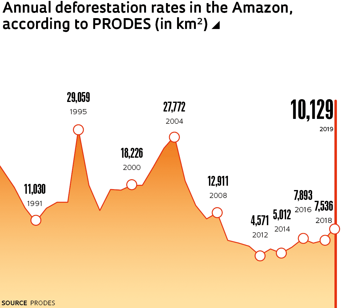 The INPE also released another figure showing that deforestation in the Legal Amazon has risen. Called the deforestation index, it is also based on PRODES data, but includes areas of any size, including those smaller than 6.25 hectares. It suggests that the total area deforested in the Amazon in 2019 was 10,896 km2. Calculated since 2008, the index tends to be slightly higher than the official deforestation rate, but the two numbers tell the same story. The deforestation index, however, allows clearing to be monitored in municipalities, conservation units, and indigenous reservations, which is not possible with the official annual rate. “We know the exact spatial location of each deforested area,” says Almeida.