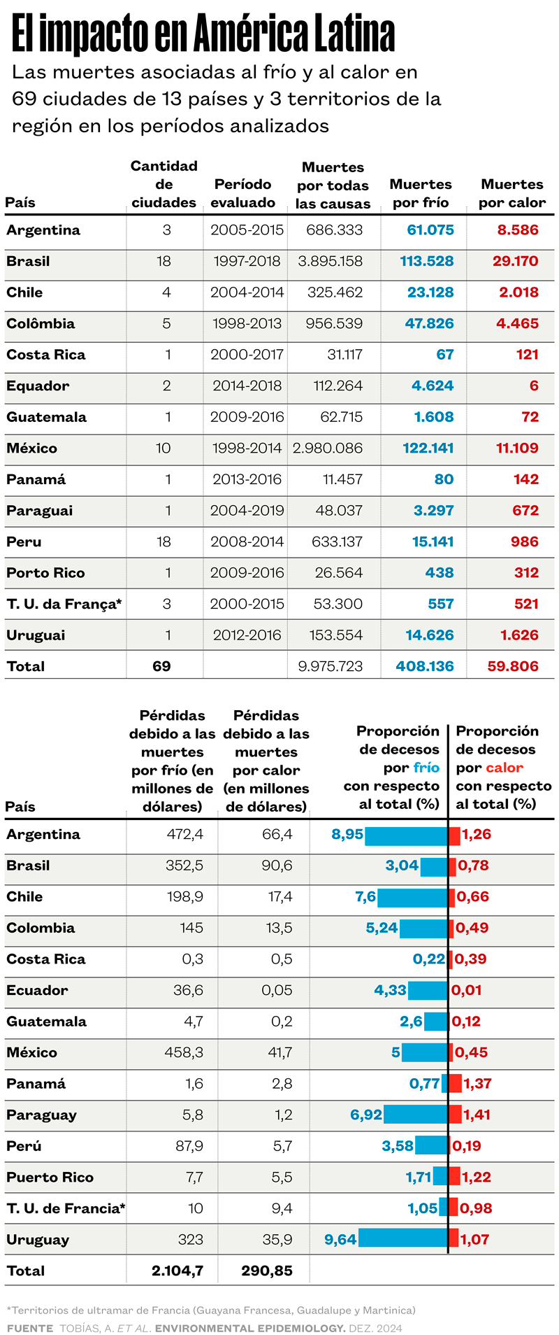Saldiva y Coelho forman parte de una red internacional de investigación que, en la última década, ha empezado a calcular el impacto de los días más calurosos y más fríos sobre la salud de las personas y en la economía. En un estudio reciente, publicado en la edición impresa de diciembre de la revista Environmental Epidemiology, el dúo brasileño e investigadores de otros nueve países calcularon el porcentaje de muertes que pueden atribuirse al calor y al frío extremos en trece naciones de América Latina y tres territorios franceses de ultramar en el continente, como así también cuánto representan en pérdidas económicas.