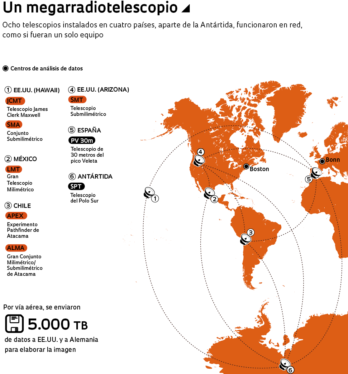 La imagen es la evidencia más directa de la existencia de un agujero negro. Ella es el resultado del esfuerzo de los más de 200 científicos que integran el proyecto Telescopio Horizonte de Eventos (EHT, según su sigla original en inglés), un consorcio internacional que se valió de datos recabados por ocho observatorios de radioastronomía instalados en diferentes sitios del planeta y programados para funcionar como si fuesen un único radiotelescopio del tamaño de la Tierra.
