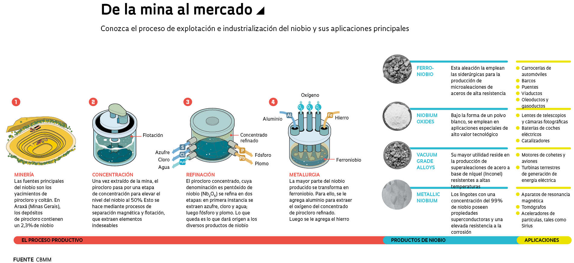 CBMM es la única empresa en el mundo que provee todos los productos derivados del niobio. “Desde un comienzo invirtió fuertemente en el proceso de fabricación de ferroniobio y de otros productos elaborados con ese metal”, informa el ingeniero metalúrgico Fernando Gomes Landgraf, docente de la Escuela Politécnica de la Universidad de São Paulo (Poli-USP). El proceso de explotación e industrialización del niobio en Araxá se realiza en 15 etapas. Todo comienza a partir de su extracción de la naturaleza. Las principales fuentes de niobio son los yacimientos de un mineral denominado pirocloro. La mina de CBMM contiene solamente un 2,3% de niobio, un porcentaje pequeño, aunque superior a la de la mayoría de las reservas de todo el mundo. La fracción restante está compuesta por mineral de hierro en diversas formas, óxido de bario y fosfato, aparte de otros elementos, entre los que se cuentan azufre y silicio, por ejemplo.