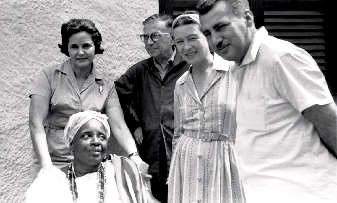 De izquierda a derecha, Zélia Gattai, los filósofos Jean-Paul Sartre y Simone de Beauvoir y Amado con Mãe Senhora (sentada) en la década de 1960, en Salvador [Bahía]