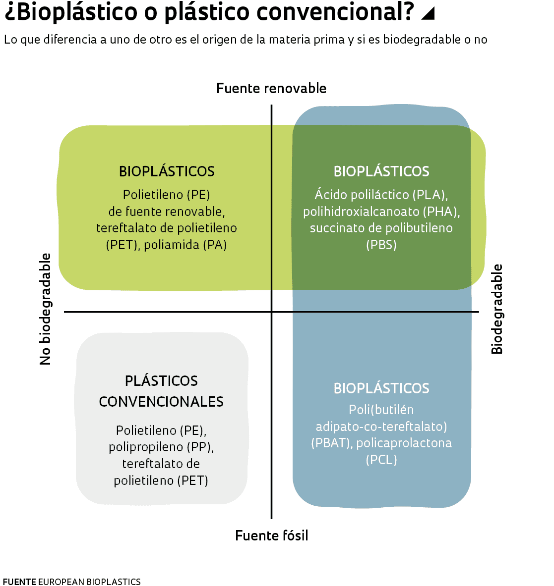 Clasificación de los bioplásticos El concepto adoptado por la European Bioplastics para la clasificación de los bioplásticos, al cual adhirieron buena parte de los países, contempla dos vertientes: una relacionada con el origen del material y otra asociada a su degradación. A un material se lo considera bioplástico si proviene parcial o totalmente de una fuente renovable, es decir, si es derivado de biomasa: maíz, caña de azúcar, celulosa, etc. En ese caso, no precisa ser necesariamente biodegradable para que se lo considere un biopolímero.