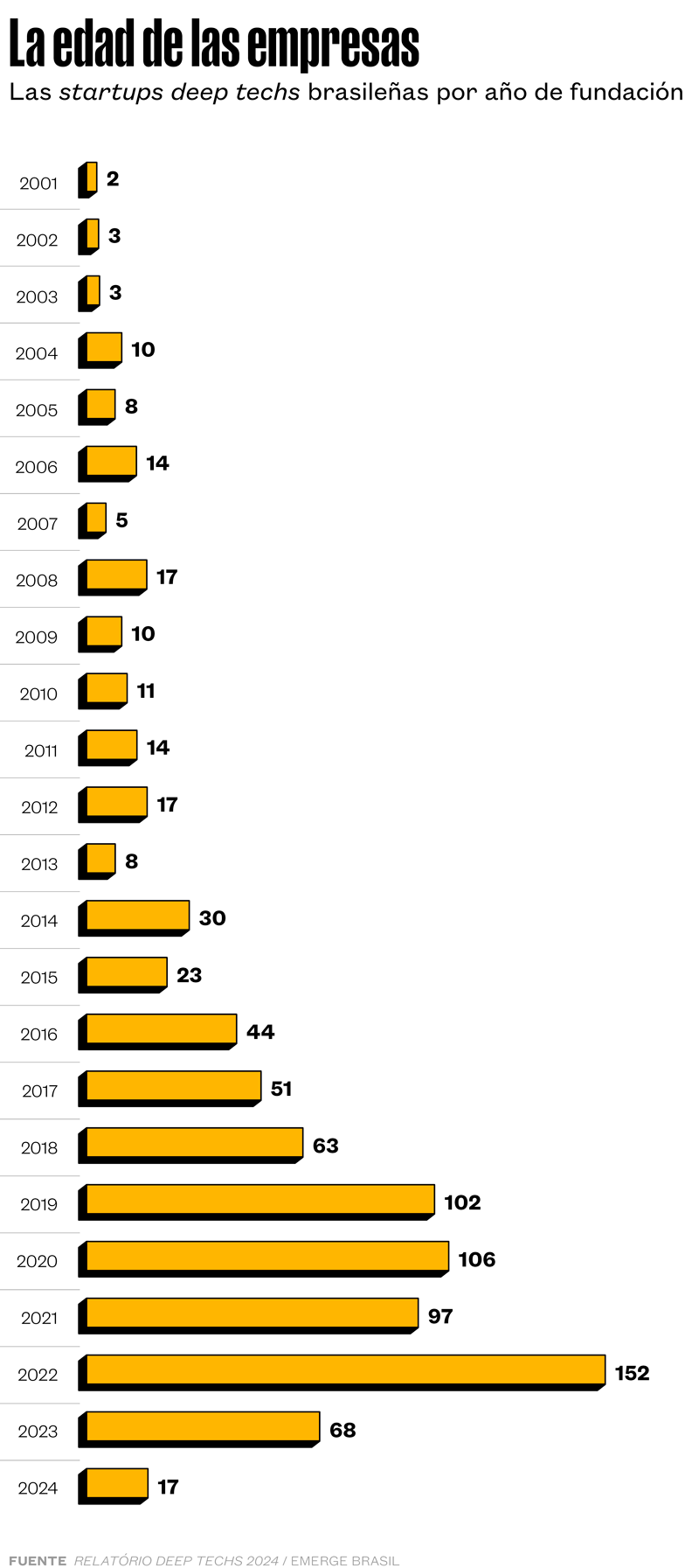 En la investigación se consignó que el 70 % de las empresas mapeadas aún madura sus tecnologías, mientras que el 30 % avanzó hacia la etapa de ganar escala y salir al mercado. Las que tienen éxito en general tardan cinco años para empezar a crecer. “Como se ubican en la frontera de la ciencia, muchas requieren más tiempo para madurar”, explica Guilherme Ary Plonski, profesor sénior del Instituto de Estudios Avanzados (IEA) y de la Facultad de Economía, Administración, Contabilidad y Ciencia Actuarial (FEA) de la Universidad de São Paulo (USP). En el trabajo se estimó que un 20 % de las deep techs brasileñas crecería en 2024, mientras que un 6 % podría reducir su facturación anual. En su mayoría –un 62 %– fueron fundadas durante los últimos cinco años.