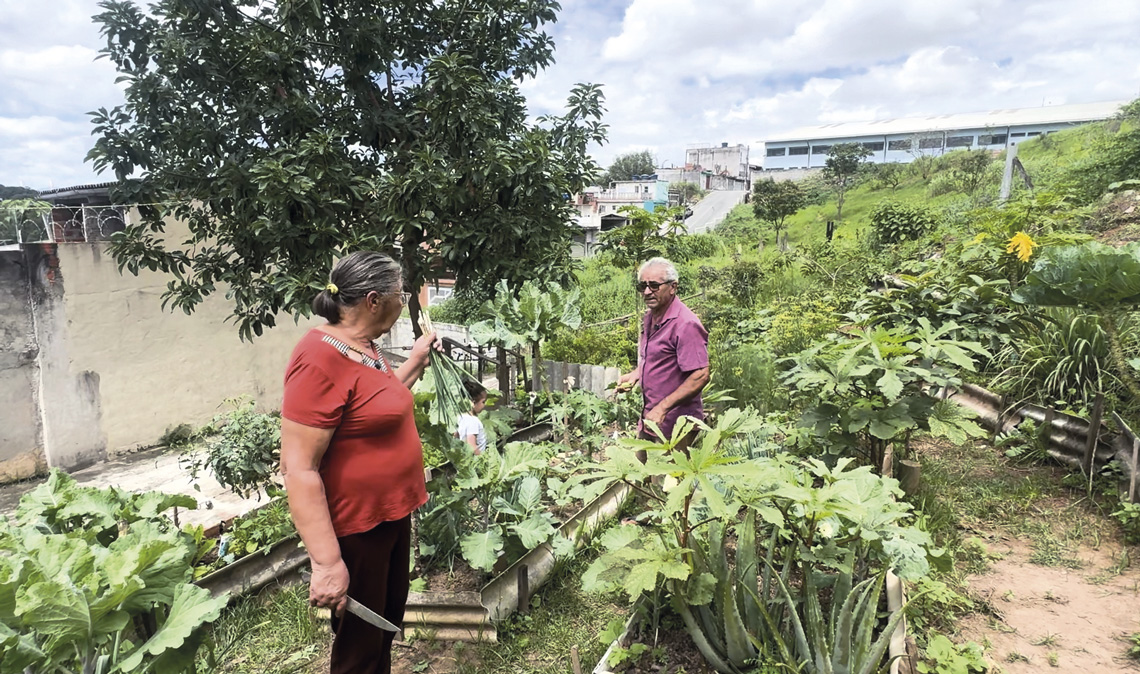 Es lo que sucede con Eliane, nacida en el interior del estado de Río de Janeiro, y su marido Toninho, oriundo de Minas Gerais, quienes viven en el barrio de Pimentas desde los primeros días de esa urbanización, en la década de 1990. “Cada verano ellos reparten uvas entre el vecindario”, cuenta Barbosa. “La superficie de 100 m2 de lo que hoy en día es el patio de la pareja está cercada por los muros de los vecinos del fondo y de ambos lados. Allí cultivan parras y otros 20 árboles frutales, además de una huerta con plantas comestibles y medicinales, la mayoría en macetas”, comenta la investigadora.