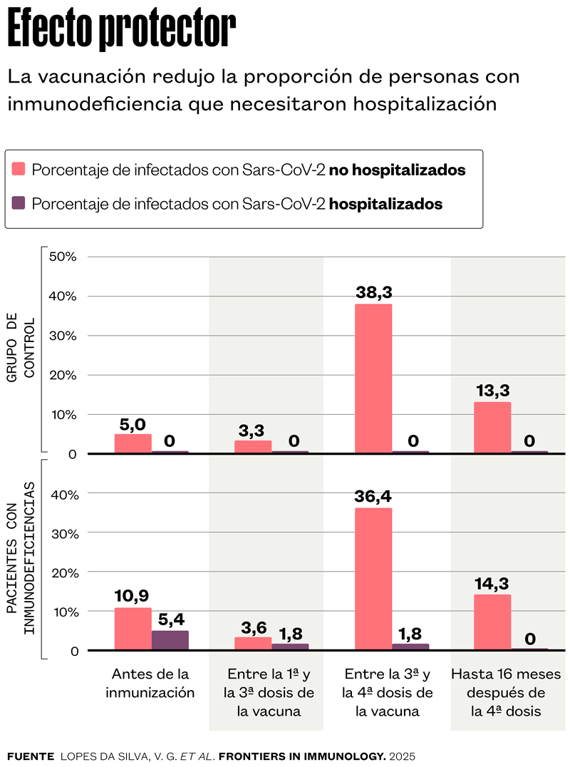 El efecto más importante que observó el grupo de la Unifesp fue la reducción de las tasas de hospitalización a medida que se iba completando el esquema de vacunación. Antes del inicio de la inmunización, que en Brasil comenzó en mayo de 2021 para las personas con errores de inmunidad congénitos, 9 de los 55 participantes (el 16,3 %) tuvieron covid-19, de los cuales 3 (el 5,4 %) requirieron internación y 6 (el 10,9 %) no. El porcentaje de personas que debieron ser hospitalizadas descendió al 1,8 % luego de la aplicación de la primera dosis, aun cuando la variante ómicron circuló en el país e infectó a casi un 40 % de los participantes. La tasa de internación llegó a cero después de la cuarta dosis. Dentro del grupo de los participantes sanos, ninguno debió ser hospitalizado a lo largo de todo el seguimiento (véase el gráfico abajo). “Estos datos ponen de relieve la importancia de un esquema de vacunación primario con tres dosis para los pacientes con errores de la inmunidad innatos, así como la necesidad de aplicar dosis de refuerzo cada seis meses”, dice Lopes da Silva.
