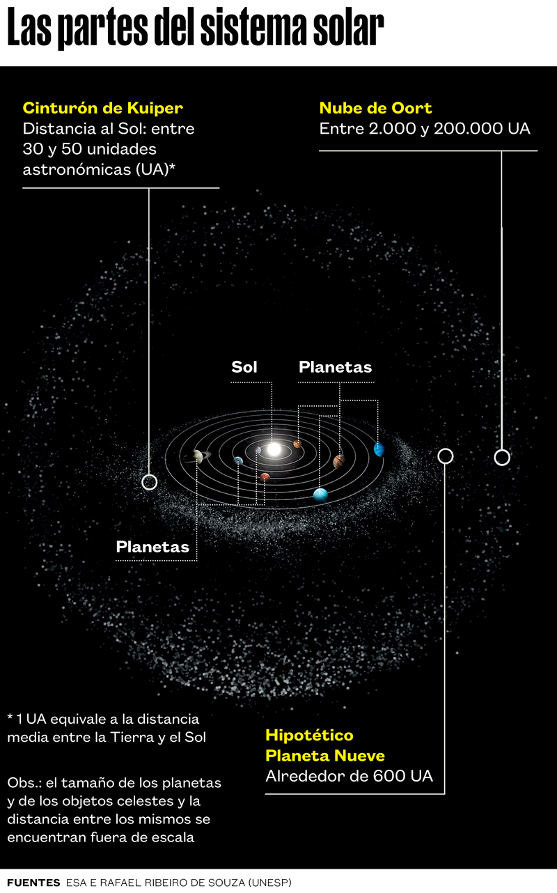 Si este nuevo mundo realmente existe y se encuentra en donde lo sugiere el artículo, será todo un reto obtener una prueba concluyente de su presencia en los confines del Sistema Solar. Un cuerpo celeste situado a 600 UA estaría mucho más allá de los dominios del cinturón de Kuiper, cuyos objetos, a grandes rasgos, están ubicados a entre 30 y 50 unidades astronómicas del Sol. De momento no existen instrumentos de observación capaces de escudriñar con claridad lo que existe más allá de dicho cinturón, una estructura ubicada 20 veces más cerca de la Tierra que el recóndito lugar donde podría hallarse el Planeta Nueve. En un sentido estricto, según los cálculos de los brasileños, este mundo estaría “perdido en el espacio interestelar”, entre donde termina el cinturón y el comienzo de la hipotética nube de Oort.