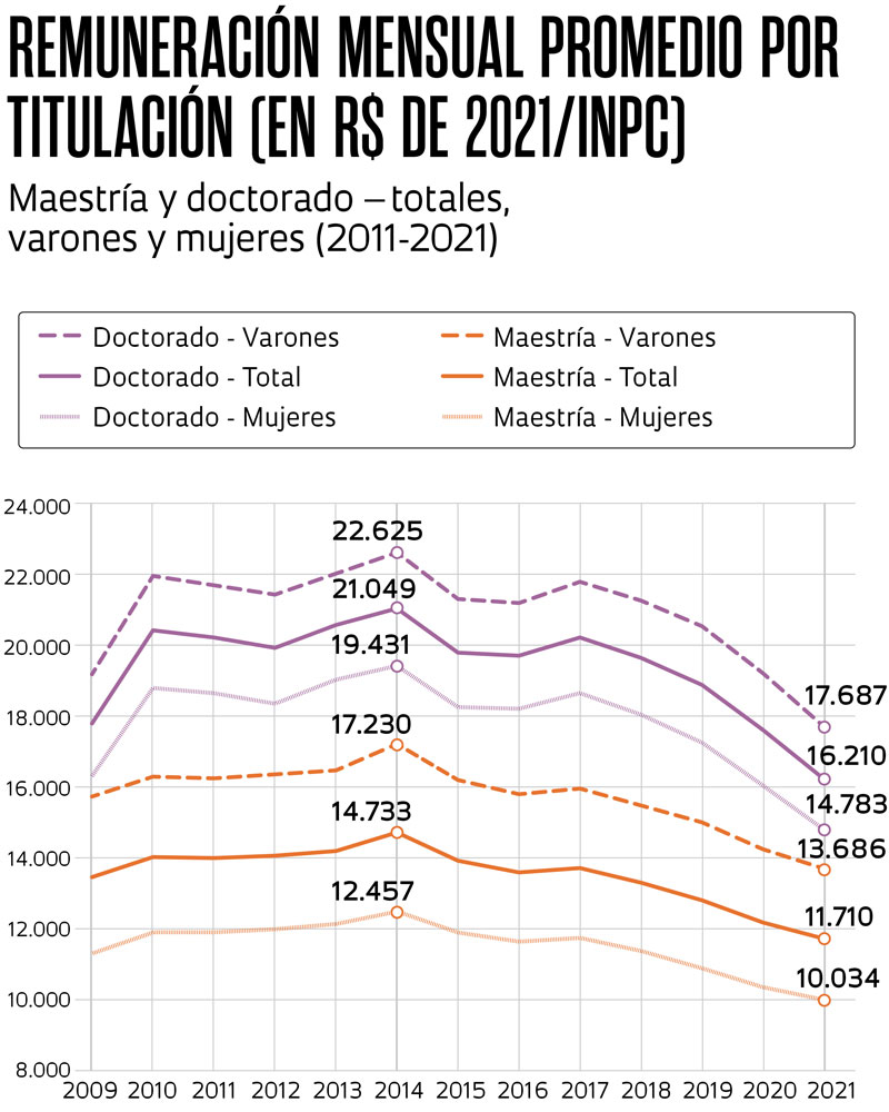 - Esto fue así tanto para varones como para mujeres entre 2014 y 2021. Entre los doctores, la reducción salarial fue más pronunciada entre las mujeres (un 24 %) que entre los varones (un 22 %). En el caso de los magísteres, la caída fue de un 21 % entre los varones y de un 19 % entre las mujeres