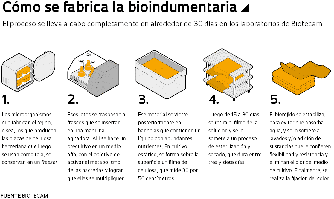 En Brasil, la empresa Biotecam, cuya actividad principal es la fabricación de sistemas de purificación de agua para estaciones de tratamiento y para los lagos y ríos utilizados en la piscicultura, comenzó a invertir en el sector de los tejidos bacterianos hace tres años, cuando fue invitada a participar de una iniciativa del Museo del Mañana, también en la capital fluminense. “Ellos tenían un proyecto para hacer wearables [ropa inteligente] introduciendo microelectrónica en prendas de vestir. Nos pidieron que colaboráramos con la elaboración de una tela celulósica a base de bacterias que sería la materia prima para los experimentos”, relató Degrave.