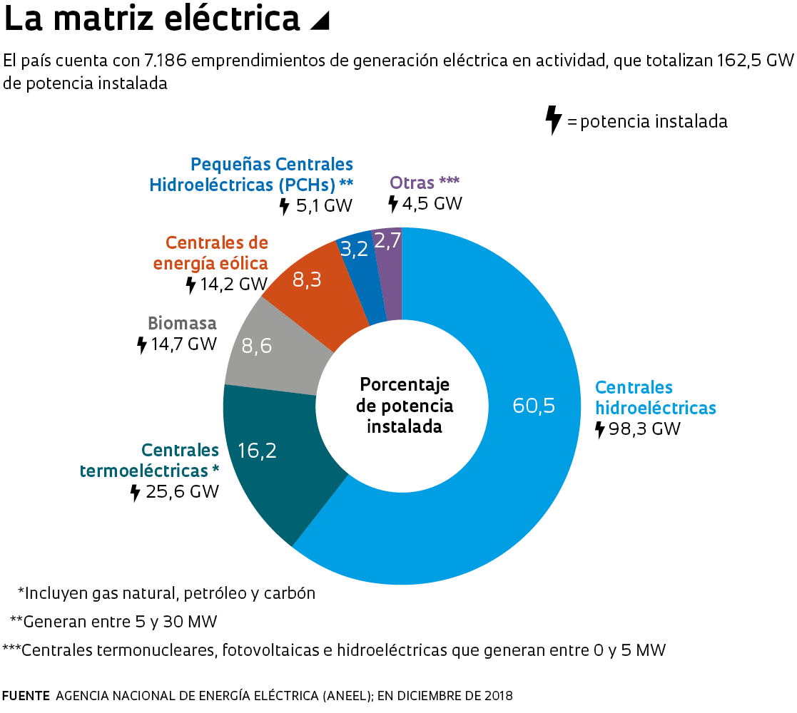 De acuerdo con la Asociación Brasileña de Energía Eólica (ABEEólica), el potencial para la generación de energía eólica en Brasil está estimado en alrededor de 500 gigavatios (GW). Es lo suficiente como para satisfacer el triple de la demanda energética actual del país. Y es una cifra más de tres veces superior al actual parque nacional de generación de electricidad, incluidas allí todas las fuentes disponibles: hidroeléctrica, biomasa, gas natural, petróleo, carbón y energía nuclear. En diciembre de 2018, la capacidad de generación instalada llegó a los 162,5 GW, según la Agencia Nacional de Energía Eléctrica (Aneel). De este total, las centrales eólicas representaron 14,2 GW, el equivalente a la capacidad instalada de la central hidroeléctrica de Itaipú, de 14 GW, una cantidad suficiente como para abastecer a 22 millones de hogares. La energía generada por la fuerza de los vientos ocupa el cuarto lugar en la matriz eléctrica brasileña (vea la infografía al lado).