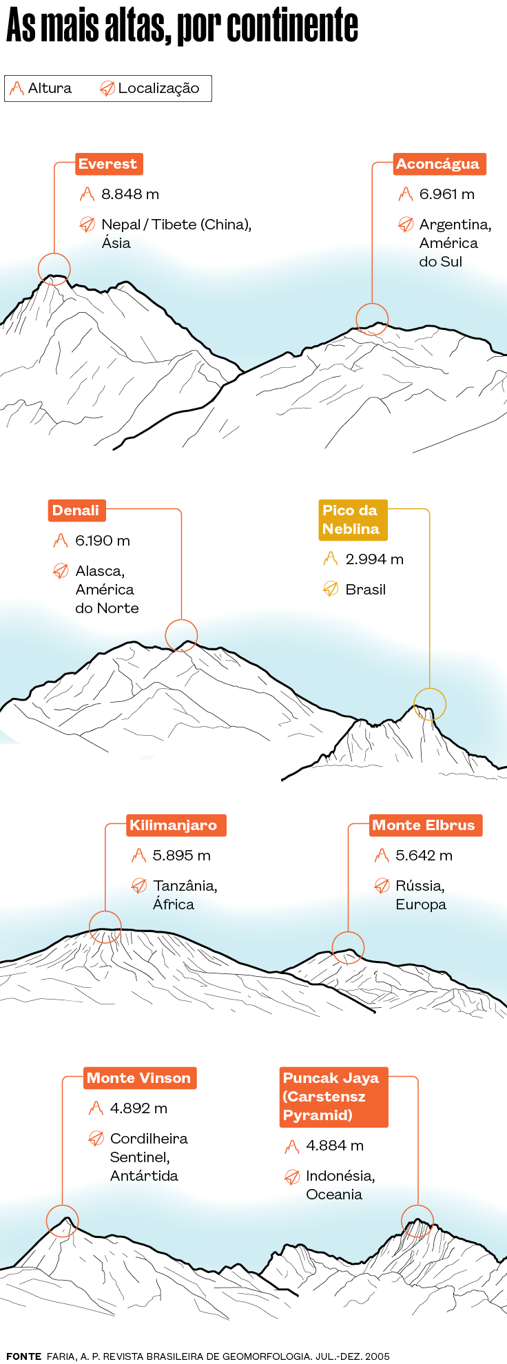 As brasileiras são geologicamente bem mais antigas do que as mais conhecidas, como o Himalaia e os Andes, e já bastante desgastadas pela erosão. Seu reconhecimento poderia incentivar o turismo, promover a conservação da biodiversidade e reforçar o alerta contra o risco de deslizamentos de terra em suas encostas íngremes. Os especialistas responsáveis por essa reclassificação já divulgaram vários estudos regionais e o IBGE ainda deve publicar um mapa reunindo as montanhas do Brasil. Definidas como formas de relevo agrupadas com pelo menos 300 m de altura em relação às áreas vizinhas, com topos aguçados e encostas íngremes, elas despontam em 14 estados, de Roraima a Santa Catarina, da Paraíba a Mato Grosso. No Rio de Janeiro, ocupam um terço do território, embora as áreas maiores estejam na Bahia, em Minas Gerais e no Ceará.