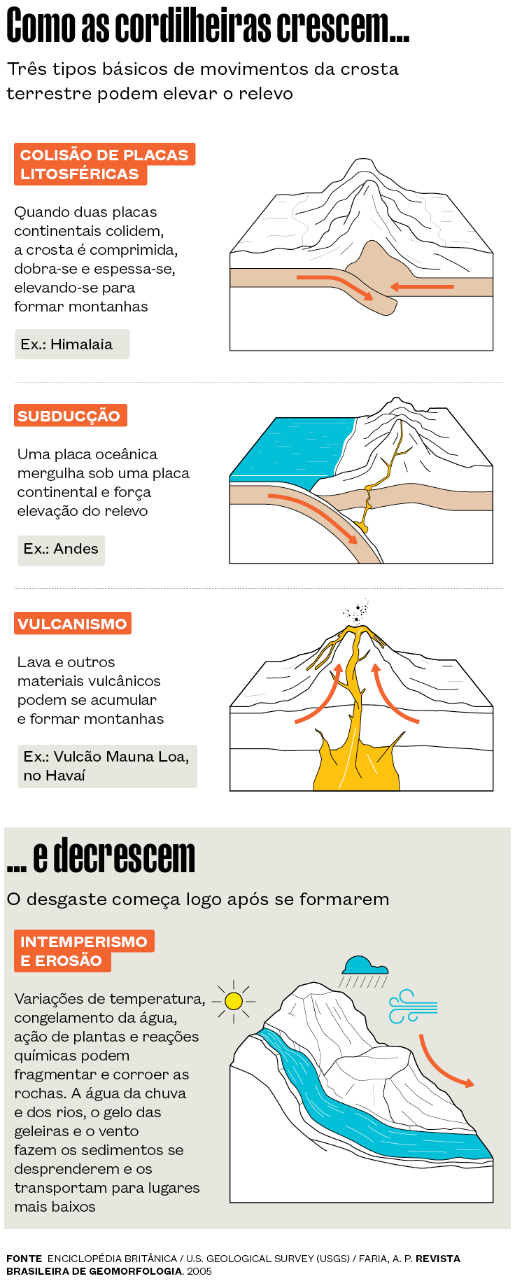 “As montanhas jovens como os Andes, os Alpes e o Himalaia, que começaram a se formar entre 120 milhões e 50 milhões de anos atrás, estão associadas a áreas de convergência de placas”, comenta o geólogo Celso Dal Ré Carneiro, da Universidade Estadual de Campinas (Unicamp), que participou da redefinição dos conceitos do relevo brasileiro.