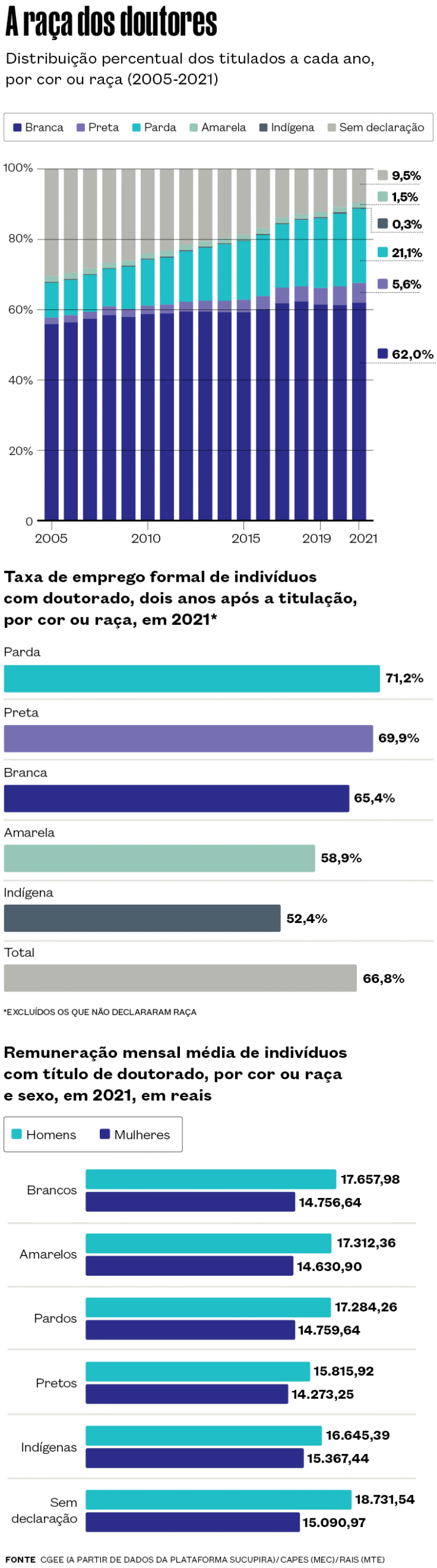 Cresceu ao longo das últimas três décadas a proporção de pretos, pardos e indígenas entre as pessoas que concluem cursos de pós-graduação stricto sensu no Brasil, embora os brancos ainda sejam perto de dois terços dos formados (68,6% dos doutores e 62,9% dos mestres titulados em 2021). Em todas as regiões brasileiras, o percentual de brancos entre os pós-graduados é maior do que a proporção de seu grupo racial na população regional. No Sul, os brancos são 72,6% dos habitantes, mas concentraram 84,4% dos títulos de mestrado e 85,6% dos de doutorado em 2021.