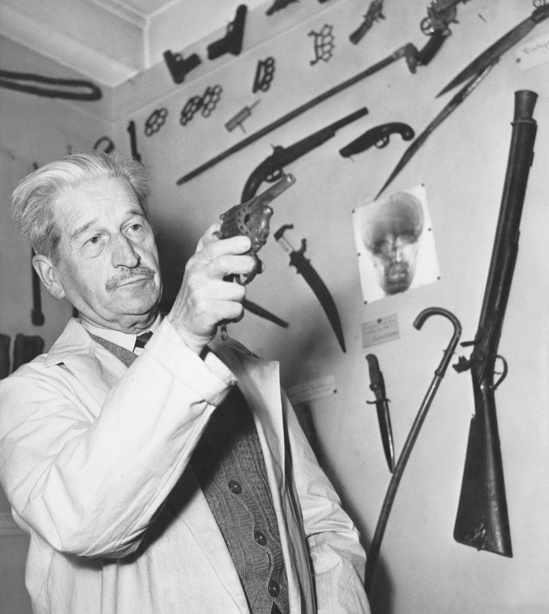 Keystone / Hulton Archive / Getty ImagesEdmond Locard, pioneiro da ciência forense na França que acompanhou o trabalho de Galdino Ramos, com a coleção de armas confiscadas de criminososKeystone / Hulton Archive / Getty Images