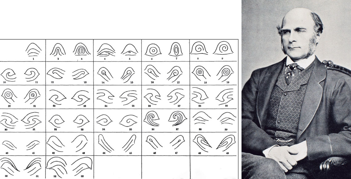 PEARSON, K. The life, letters and labours of Francis Galton. 1914Padrões de linhas de digitais da mão direita analisados no livro Finger prints, publicado por Francis Galton em 1892PEARSON, K. The life, letters and labours of Francis Galton. 1914