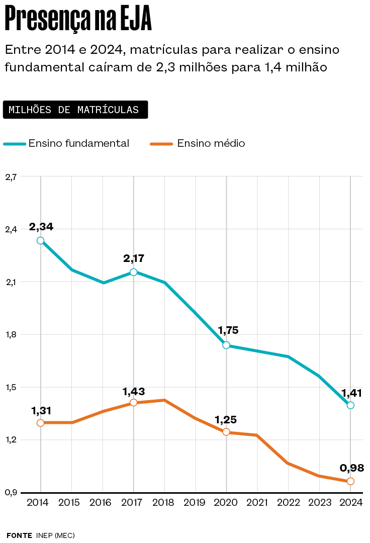 Destinada a pessoas que não concluíram a educação básica, a EJA registrou em 2024 o menor número de matrículas dos últimos 20 anos, de acordo com o Censo Escolar divulgado no ano passado pelo Instituto Nacional de Estudos e Pesquisas Educacionais (Inep). O levantamento indica que entre 2015 e 2024 as matrículas caíram de 3,5 milhões para cerca de 2,4 milhões, consolidando um processo de esvaziamento progressivo da modalidade. “É um número muito baixo, considerando o contingente de brasileiros que não concluíram a educação básica, cerca de 68 milhões de pessoas”, relaciona Zara Figueiredo, secretária de Educação Continuada, Alfabetização de Jovens e Adultos, Diversidade e Inclusão (Secadi), órgão criado pelo MEC em 2023.