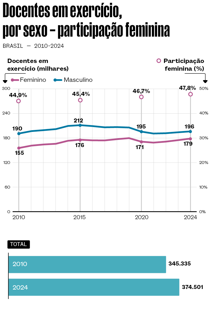 - Nos sistemas estaduais, no mesmo período, o número de funções docentes passou de 45 mil para 54 mil, com a participação feminina mantendo-se próxima de 47%. Já nas municipais, houve pouca alteração