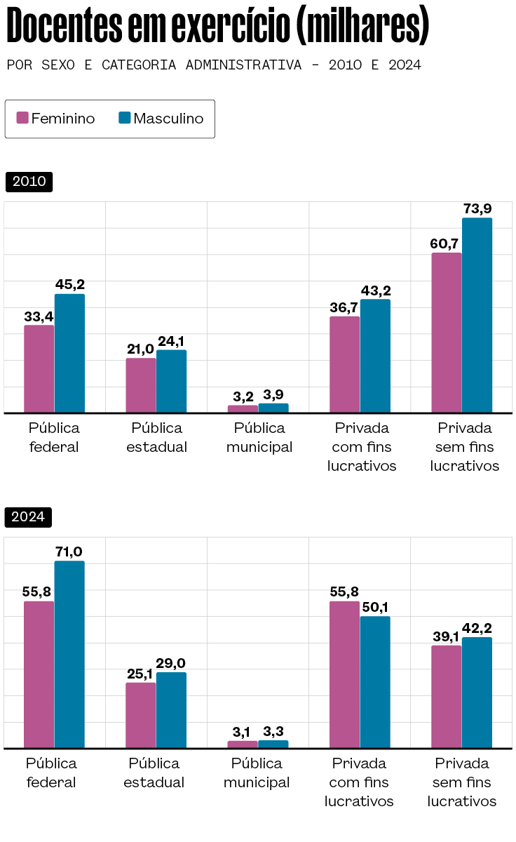 - No setor privado, o número de funções docentes nas instituições sem fins lucrativos diminuiu de 135 mil para 81 mil, enquanto a participação feminina passou de 45% para 48%