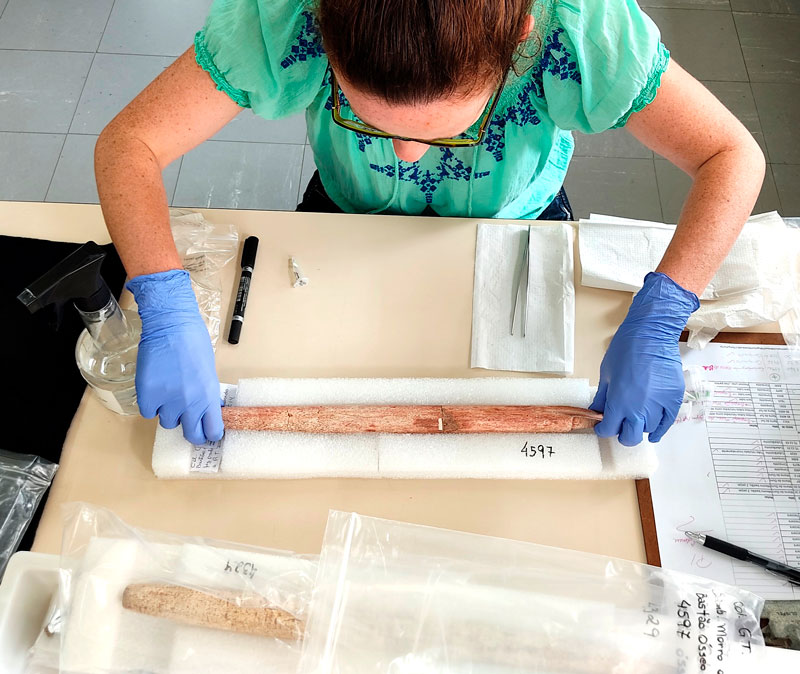 ERC-TRADITIONA arqueóloga biomolecular Krista McGrath, da UAB, prepara arpão do sítio Morro do Ouro para análiseERC-TRADITION