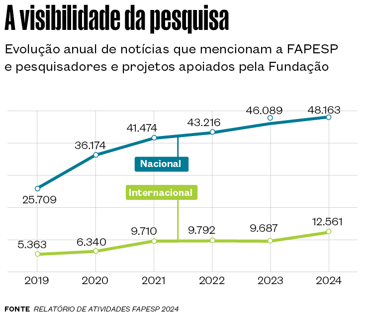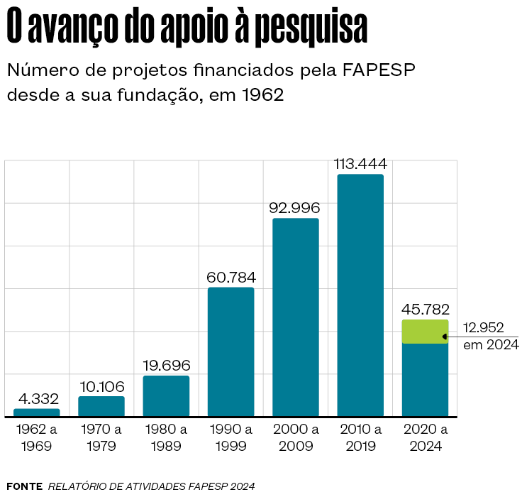 Esse balanço foi divulgado no Relatório de atividades FAPESP 2024, lançado em setembro. O documento está disponível no site da Fundação, no qual é possível obter os dados anuais do financiamento da instituição desde 1962, quando a FAPESP iniciou suas atividades. O progresso alcançado em 2024 foi estimulado por ações da Fundação tanto no sentido de facilitar os processos de submissão e de avaliação de propostas apresentadas por pesquisadores quanto em atualizar o teto orçamentário de projetos (de R$ 300 mil para R$ 600 mil, no caso de auxílios regulares à pesquisa) e os valores de bolsas (reajustadas em até 45%). No caso dos bolsistas de pós-doutorado, a FAPESP passou a garantir o ressarcimento da contribuição previdenciária e ampliou a duração das bolsas de 24 para 36 meses. Em 2024, a FAPESP financiou um total de 10.275 bolsas no país e no exterior, 30% a mais do que no ano anterior. “2024 foi um ano de avanços importantes para a pesquisa, para o fomento e para a própria FAPESP, quando se consolidou a recuperação do período da pandemia, reforçando uma perspectiva otimista para o sistema paulista de ciência, tecnologia e inovação”, escreveu na apresentação do relatório Marco Antonio Zago, presidente do Conselho Superior da Fundação.